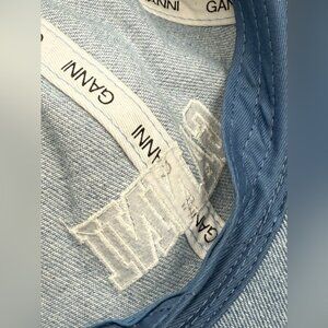 Stylish blue denim cap by GANNI. Features embroidered logo on the front and an adjustable strap.