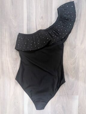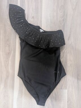 Style Name: Rhinestone Ruffled One-Shoulder Bodysuit / Swimsuit