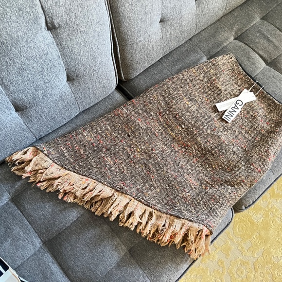 Falling to an asymmetrical fringe hem, this skirt is a twist on a classic pencil skirt in a textural wool-blend fabrication. Asymmetrical hem Fringe trim Recycled wool/polyamide Spot clean Imported. Contemporary Sportswear - Contemporary Collections > Ganni > Revolve > Saks Fifth Avenue > Barneys. GANNI. Color: Brazilian Sand. Size: 34
