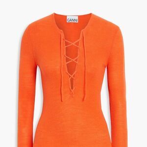 GANNI Wool Pullover Jumper Size XXS Thin Knit Lace Up Front Long Sleeves RRP€144
