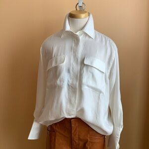 Indulge yourself in the luxury of this elegant button down blouse by GANT. Features chic large flap pockets and a dagger collar on an oversized shirt design. Double-length cuffs and a silky sheen add unexpected drama. GANT is a timeless luxury brand based in Stockholm, Sweden.