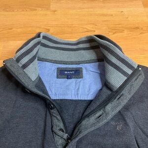 • Features: Quarter-zip with button-over placket, elbow patches, ribbed cuffs and hem, embroidered GANT shield logo on chest.