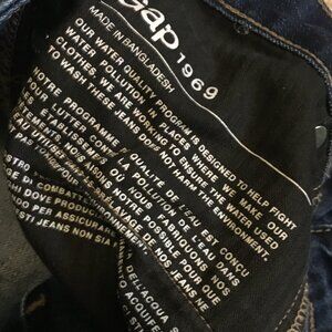 Very good preowned condition, dark navy blue, denim, long legged, Perfect Boot, bootcut jeans by GAP 1969. Features 2 pockets on front and back, zipper and button closure. Long legs, and can be worn comfortably over boots. Very nice quality.