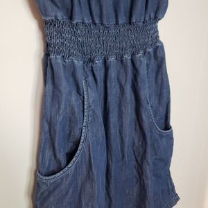 Cute denim Jumper Dress perfect for the spring and summer. Two deep front pockets, elasticised waist and ties at the back. 100% cotton.