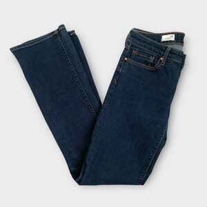 Classic low-rise bootcut jeans in a dark rinse wash with a clean silhouette and slight stretch. Fitted through the hips and thighs with a subtle flare at the hem for a leg-lengthening effect. Soft cotton blend with a bit of give.