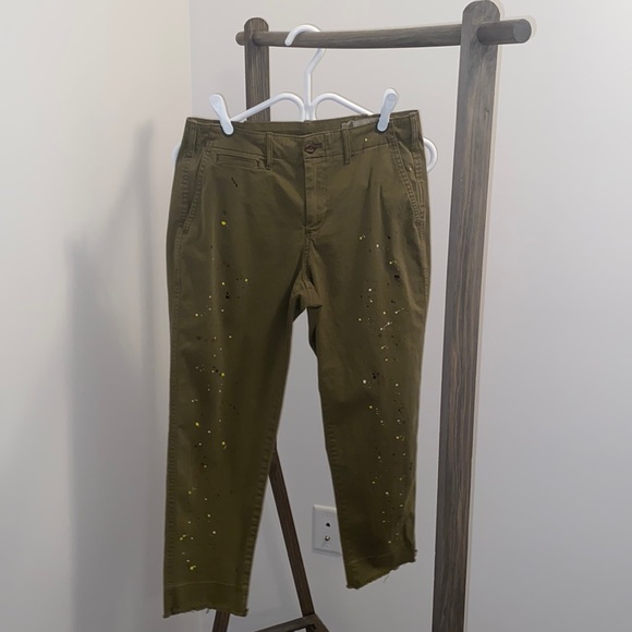 Fashion khaki printed pant. High waisted, straight leg opening, 5 pocket detailing, 7 belt loops. One button with zipper closure. Print is on both sides of pant, raw edge finish on hem of pant. Minimal stretch, gently used and in good condition! Inseam measures 24”.
