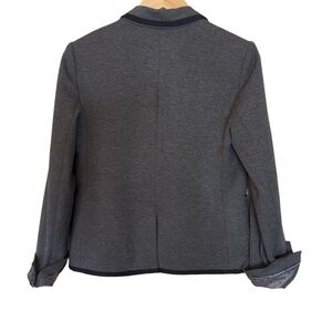 Heather grey comfort stretch blazer with navy trim and front pockets.