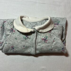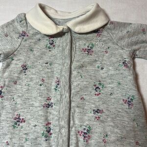 Charming gray footie One piece romper/jumpsuit with floral design. Soft and cozy for everyday comfort.