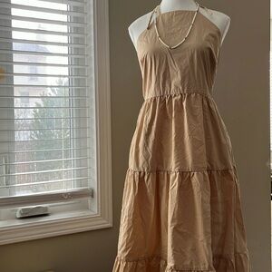 Elegant beige maxi dress. Sleeveless with a tiered design. Perfect for casual outings.