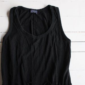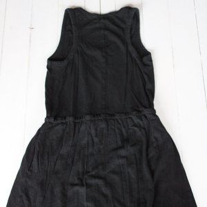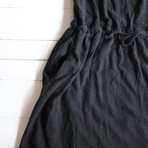 A black sleeveless linen blend dress with adjustable drawstring drop waist. V-neck. A-line. Flowy. Breathable. Lined around skirt. It has pockets!! Perfect for summer days and a woman on the go.