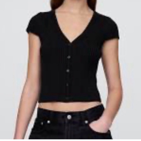 Classic black cardigan with ribbed texture. Features a button-up design.