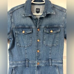 Chic denim jumpsuit with short sleeves. Includes front pockets and button accents. Size 6P