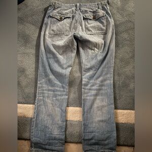 These GAP jeans feature a classic blue hue with a stylish flare and wide leg design. The natural fading and distressing patterns give them a vintage, worn-in look, perfect for adding character to any casual outfit. The denim's subtle color variations enhance its depth and appeal.