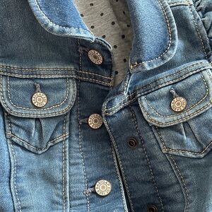 This GAP jean jacket features a classic cropped design in a medium blue denim, offering a timeless and versatile look. Made from sturdy denim fabric, it provides durability and style for any casual occasion. The jacket's folded collar and buttoned cuffs add to its traditional appeal.