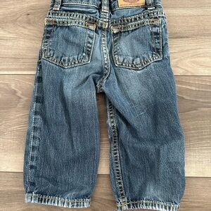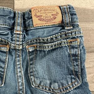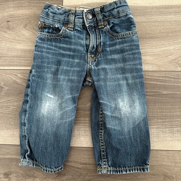 These blue jeans from GAP feature a straight-leg cut and a classic medium wash with natural fading. Crafted from durable denim, they offer a timeless look with a comfortable fit, perfect for everyday wear.