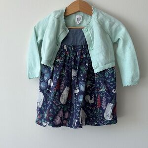 This delightful GAP sundress features a light blue top with spaghetti straps, paired with a vibrant printed skirt. The playful design is perfect for casual outings, offering comfort and style in warm weather.