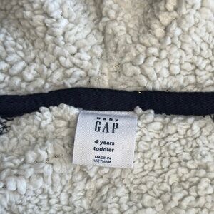 This cozy gender neutral GAP hoodie features a navy blue base with vibrant horizontal stripes across the chest. The soft material and Sherpa lined body and hood make it perfect for cooler weather, combining comfort with a splash of colour.