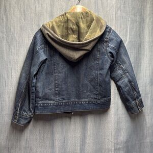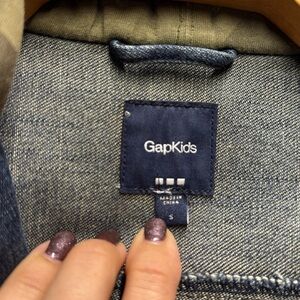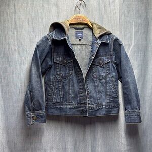 This GAP jean jacket combines classic denim with a sporty gray hood, offering a stylish and versatile look. The medium-wash blue denim and cropped design make it perfect for casual outings. Its unique blend of materials ensures comfort and fashion-forward appeal.