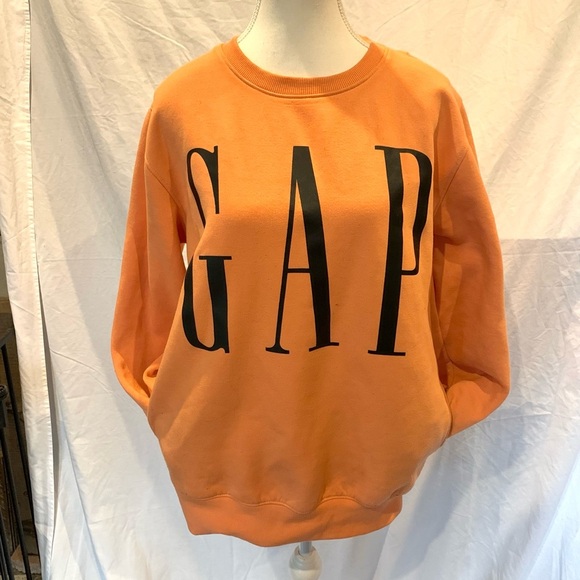 Vibrant orange crewneck sweater by GAP. Features bold logo design. Ideal for casual wear.