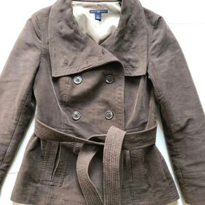 Size small. Double breasted thick fabric outside with a thinner silky lining. Pockets and waist tie. Very flattering.