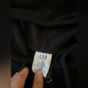 Sleek black hoodie with zip closure. Features iconic GAP branding. Perfect for casual wear.