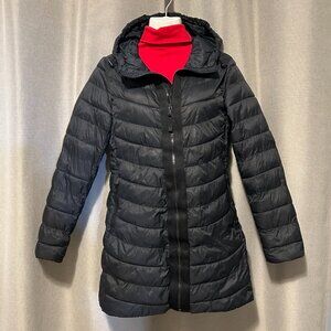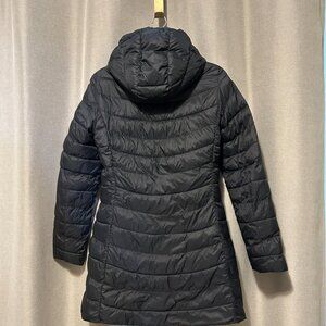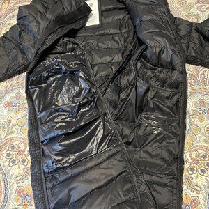 In excellent used condition. Light weight jacket is about mid thigh length for good coverage. Full zip front with attached hood and draw string pulls. Two exterior zip pockets - two interior pockets. Perfect layering piece when travelling - can be stuffed into one of the interior pockets (simply turn the pocket inside out and then fill and flip the top flap over - about 10") Compresses nicely. Nylon shell and lining - filler polyester. Red turtleneck not included.