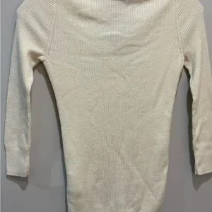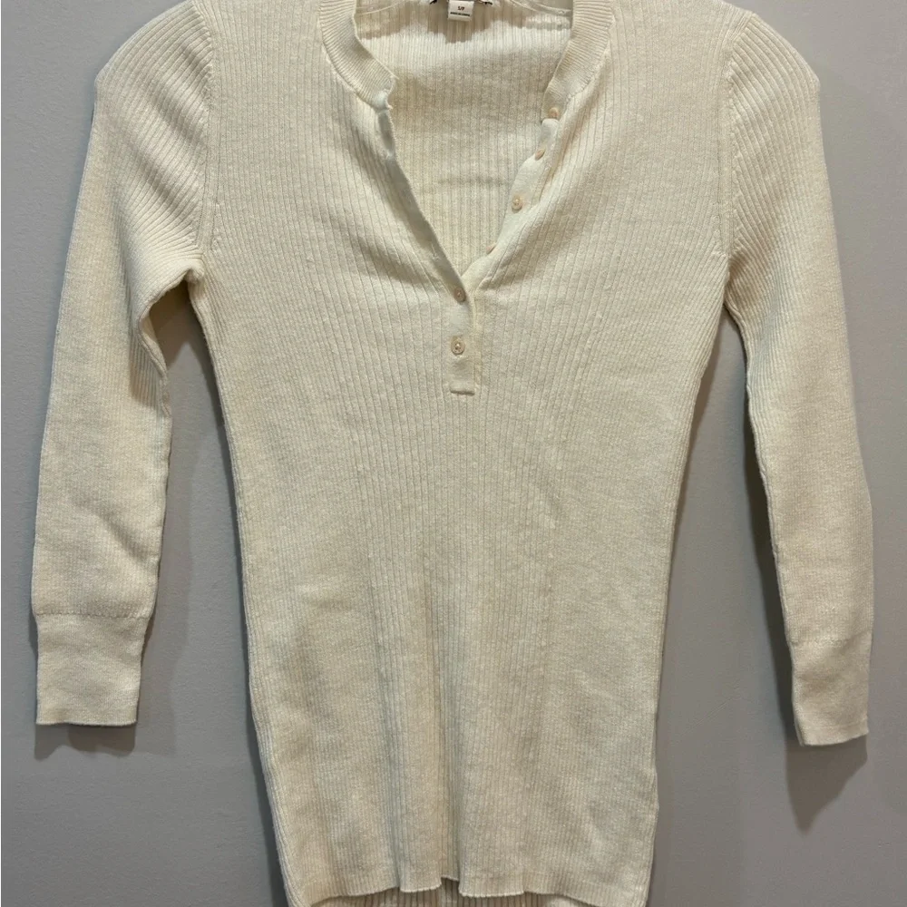 Elegant cream sweater with ribbed texture. Features button-up front. Ideal for layering.