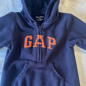 Charming dark blue infant jumpsuit with a cozy hood. Features bold orange GAP logo.