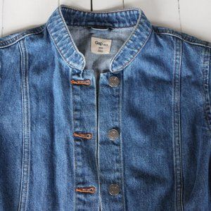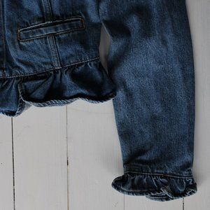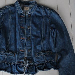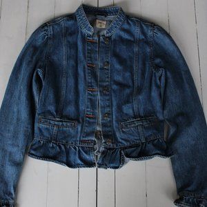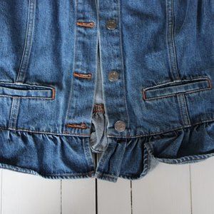 From GAP's '1969 Stand Out' Collection, a medium wash denim jacket with adorable peplum detailing. A fun statement jacket for all denim lovers. Perfect to wear over sundresses to add a feminine edge to the traditional denim jacket. Ruffle hem. Button closure.