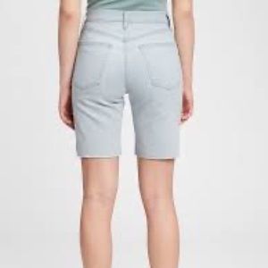 Bermuda length in light wash denim. They’re mid rise and have a little stretch. Hems are frayed and pocket edging has distressed bits. Marked as size 34/18.