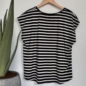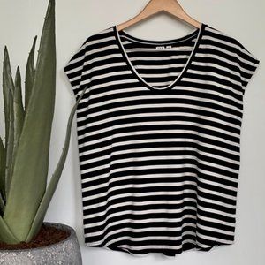 "Soft rayon cotton knit. Short sleeves. Scoopneck. Stripe print allover."