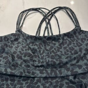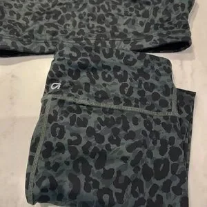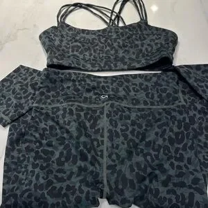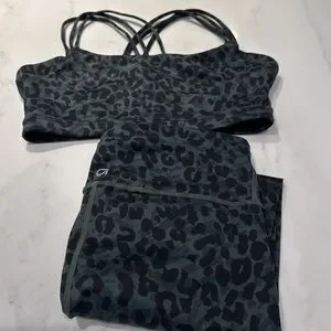 Sleek black leggings with a bold leopard print. Perfect for active wear or casual outings. Top is a S and bottom XS. Perfect condition. Inseam 22” ((7/8 crop). Super soft material. Interior pocket