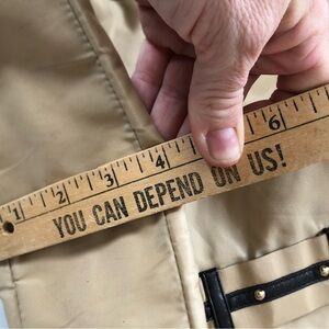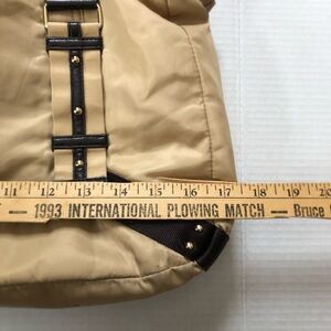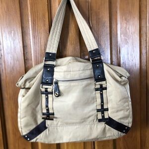Taupe and brown coloured tote bag. Clips on either side to make the bag taller if you wish. Zippered top. Zippered outside pouch and zippered inside pouch. Excellent size for all of the things you need in a day!