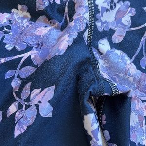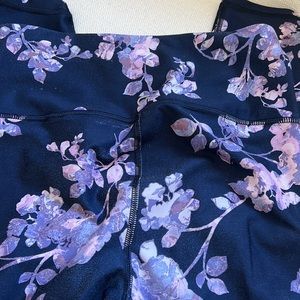 Great colours, navy with purple/lavender flowers. Lovely set for spring. XS. Minor pulling on legging. See photos.
