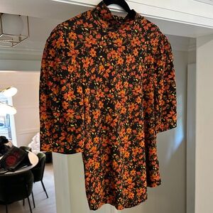 Super-pretty GAP Featherweight Puff Sleeve T-Shirt - Size L. Colour: Vibrant cornucopia red & black floral pattern. Small shoulder pads (removable). Never worn. Fabric and care shown on tag.