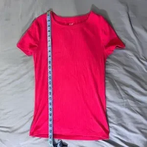 Bright fuchsia ribbed top. Features short sleeves and a round neckline. Good condition. Measurements in photos. The fabric has stretch to it.