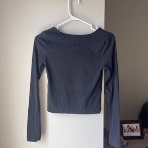 This stylish blouse from GAP features a fitted, buttoned design with a polo collar and long sleeves. The cropped length and sleek gray color make it a versatile addition to any wardrobe, perfect for a modern, stylish look.