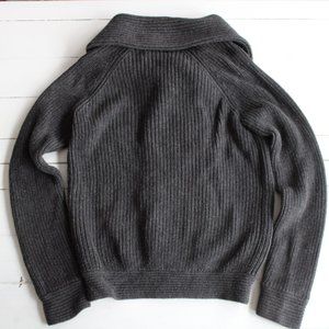 From GAP, a button up cardigan in a charcoal grey shaker knit. Thick and cozy for the winter season. Double breasted buttons. Foldover collar.