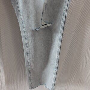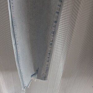 These jeans are in like new condition, Please note: There is a very slight, faint discoloration at the back right below the waistband (as shown in photos). This imperfection does not detract from the wearability of the jeans. The intentional distressing and raw hem are part of the design. The jeans do have some stretch.