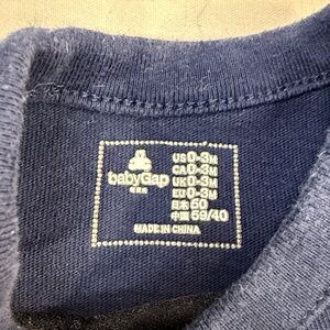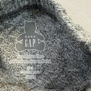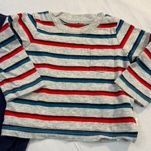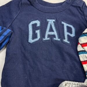 Charming GAP infant 3-piece set. Features a navy bodysuit, gray pants, and a multicolor striped top. Ideal for any event.