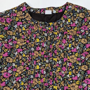 Brown lined fabric, floral colourful design, elastic sleeves, button front.