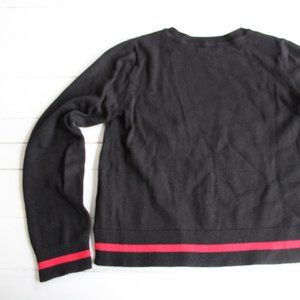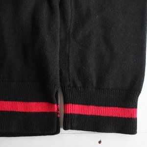 From GAP Kids, a knit holiday sweater with a pretty rose graphic. True black knit with red racing stripe and pink roses on the front. Crewneck. Pullover.