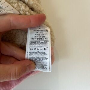 Adorable and cozy GAP Kids sherpa-lined jacket in a dusty pink corduroy. Features a soft faux shearling collar, silver logo snaps, and buttoned chest pockets for a classic denim jacket look with a soft twist. Fully lined with plush fleece body and smooth polyester-lined sleeves for easy layering. Size S (6–7). There is a small faint mark on the shoulder as shown, but overall great used condition. Measurements included in photos.