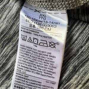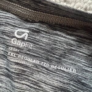 Preloved, but in great used condition. Smoke-free home. Gap Kids XXL, which is size 13-14 years (see pics of tags). 100% polyester drifit athletic material. Grey on black flecked pattern. Perfect for active preteen boy.