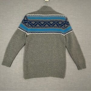 Gap Kids Zip Up Sweater. Tag Size XXL (Sz 13-14). Cotton, nylon, wool blend. Gray / grey with blue nordic pattern banded yoke. Tight knit.