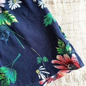 Features a bright floral design over a dark blue background and a pocket detail on the chest