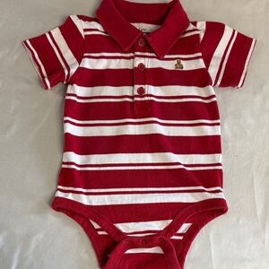 Stylish short sleeve red and white Polo Style striped bodysuit/Onesie. Paired with comfortable blue jeans. Perfect for any occasion.