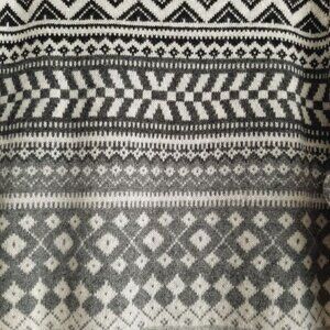 • Long sleeve crew-neck knit pullover top in fair isle ombre pattern in grey, black and white.