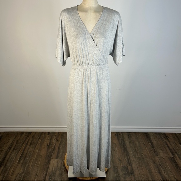 Chic light gray maxi dress by GAP. Features a flattering wrap design and flowing silhouette. Ideal for casual elegance.