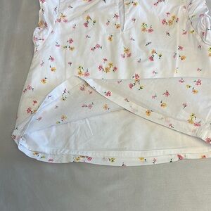 This beautiful lined blouse from GAP showcases a charming floral print in white and pink, complemented by delicate ruffles along the shoulders. Its airy design and gentle pleating at the neckline make it an ideal choice for warm weather.